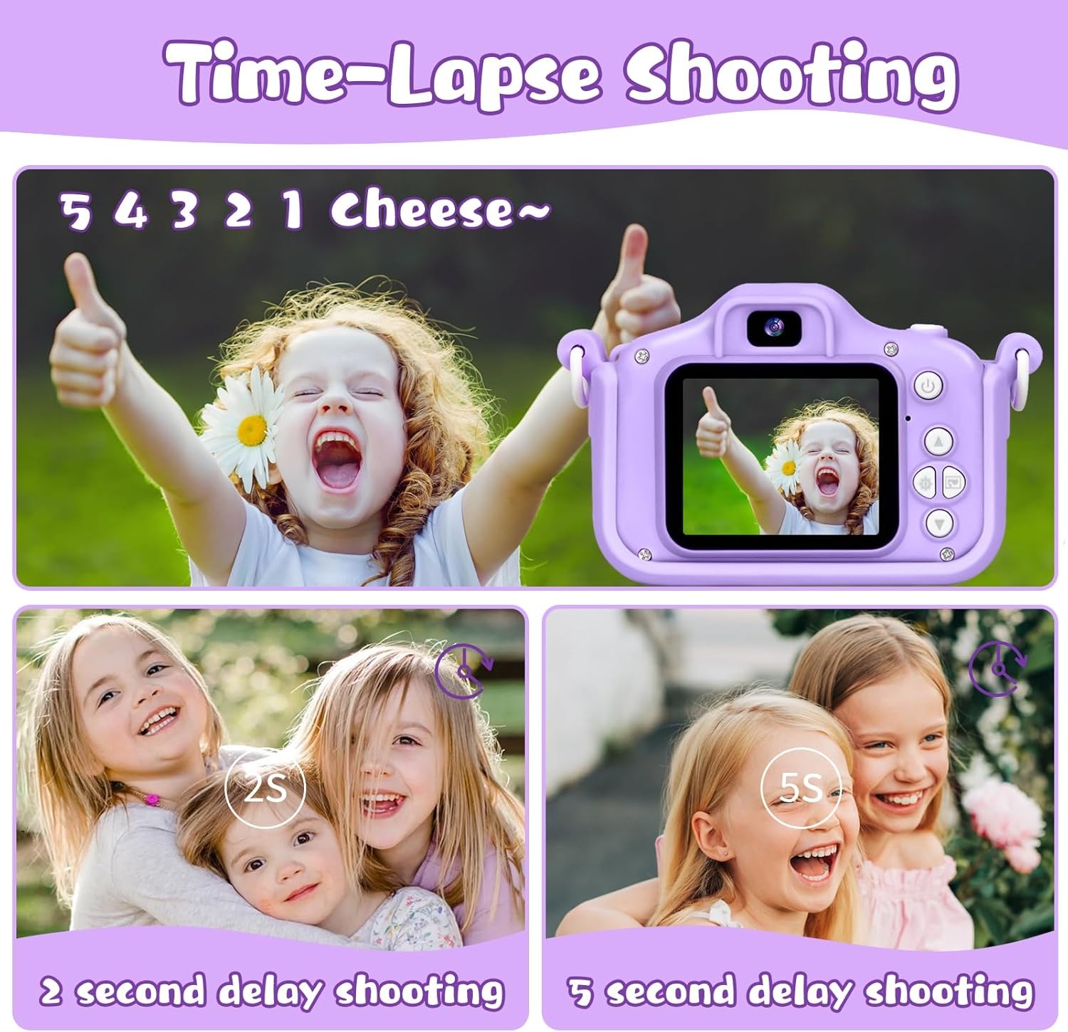 No need for batteries! 🔌 The camera comes with a built-in rechargeable battery that provides long hours of shooting and fun. Perfect for trips, parties, and playdates! 🏕️⚡
